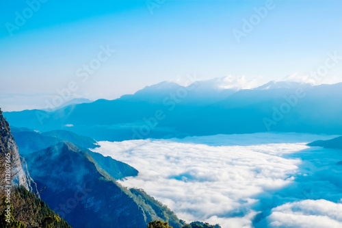 Beautiful morning sunrise, dramatic cloud of sea, giant rocks and Yushan mounatin under bright blue sky in Alishan(Ali mountain) National Park, Taiwan
