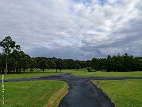 Beautiful morning view of a park with green grass, tall trees and dark cloudy sky, Fagan park, Galston, Sydney, New South Wales, Australia
