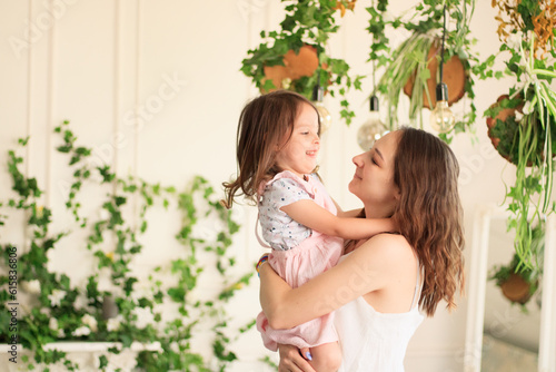 Beautiful mother and little daughter in the home interior. Baby. Motherhood.