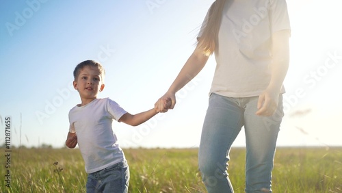 beautiful mother and son are walking. people outside family and nature concept. young mother walks holding hands with her beautiful son in the park on a lifestyle sunny day