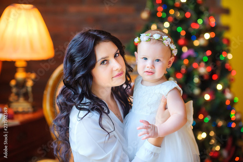 beautiful mother playing with her little daughter sitting in a chair near the festive Christmas tree