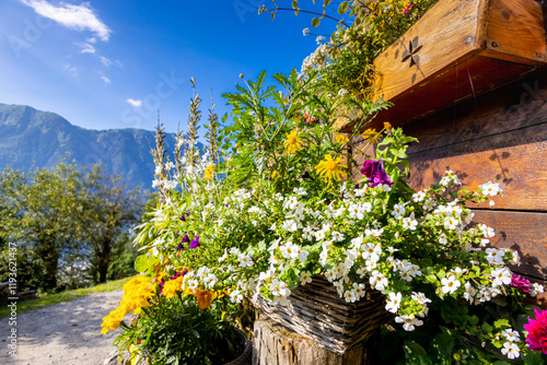 Beautiful mountain landscape of the Alps in summer on tour du Montblanc area near Courmayeur village in Val Ferret valley in Italy. European Alps stunning views of green valley with colorful flowers