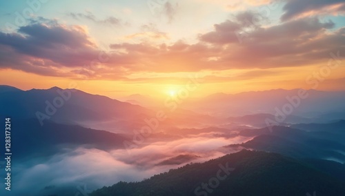 Beautiful mountain landscape with a dramatic sky at sunrise or sunset