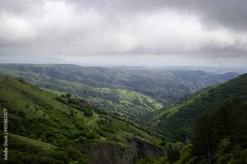 Beautiful mountain landscape, with mountain peaks covered with forest and a cloudy sky. Armenian and Georgian mountains, Caucasian mountain range