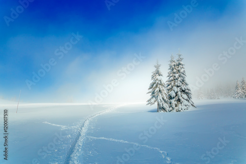 Beautiful mountain snowy landscape and snow covered trees and snowy paths in the snow. Beautiful sunny day in the mountains.