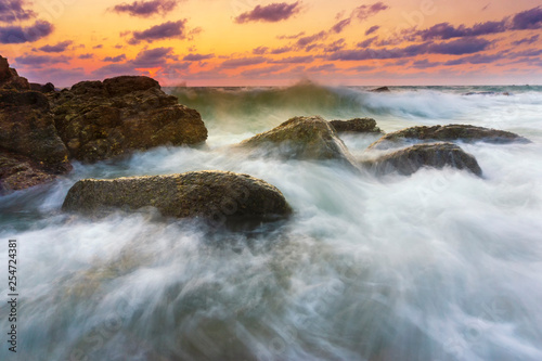 Beautiful natural seascape wave moving on the rock during sunrise