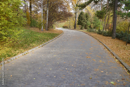 Beautiful Nature Autumn landscape. Scenery view on autumn city park with golden yellow foliage in cloudy day