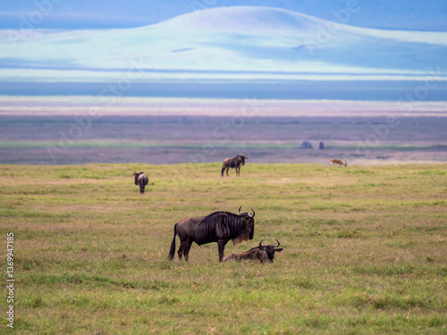 Beautiful Ngorongoro landscape with blue wildebeest (Connochaetes taurinus).