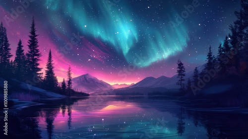 Beautiful Northern Lights aurora of the Nordic nature at night.