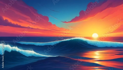 Beautiful Ocean Waves Sunset Illustration Digital Painting Background Graphic Summer Design