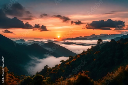 Beautiful of cloud sky colorful sunrise and view mist moving on mountain in twilight nature