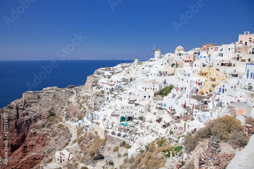 beautiful Oia town on Santorini island, Greece. Traditional white architecture and greek orthodox churches with blue domes over the Caldera, Aegean sea. Scenic travel background