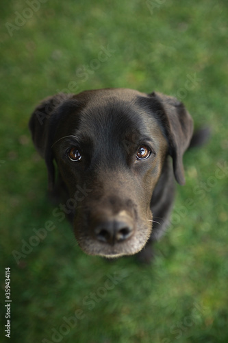 beautiful old black labrador retriever dog with big ears sitting on green grass shot from above