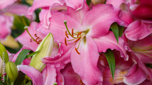 Beautiful oriental hybrids in bloom. Growing bulbous oriental lilies in the garden. Bright flower of oriental hybrids. Floral background.