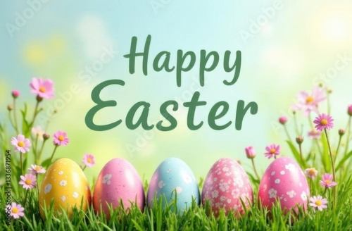 Beautiful painted Easter eggs on a green meadow, against the background of a fresh spring landscape. There are flowers nearby. The inscription or text "happy Easter". A greeting card, a wish.