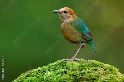 Beautiful pale green back to tail and brown head to belly bird proudly perching green mossy spot over fine blur soft background, Rusty-naped pitta (Hydrornis oatesi)