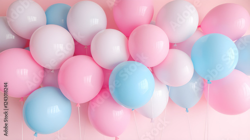 Beautiful panoramic background with pink and blue balloons. Group of pastel party balloons on soft background. Concept of happiness, joy, birthday. Generative AI