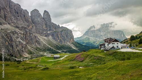 Beautiful panoramic view of Gardena pass (Passo Gardena), Italian Alps, Dolomites (Dolomiti), Italy, Europe. 4k wallpaper, HD background.