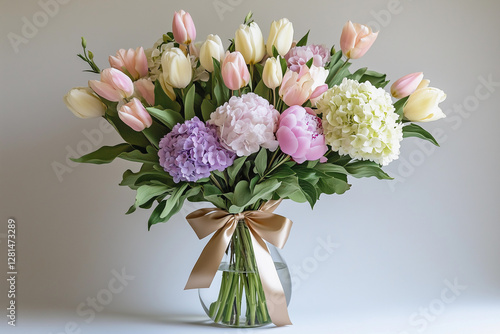 Beautiful pastel-colored arrangement of hydrangeas and tulips for special celebrations in Japan, South Korea, and Taiwan