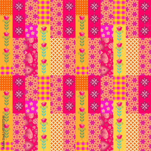 Beautiful patchwork pattern of colorful vertical stripes with flowers, leaves, abstract ornaments. Fabric print in folk style in yellow, orange, red and pink tones.
