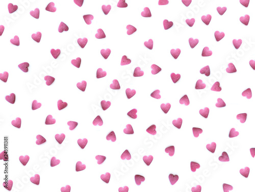 Beautiful pattern with red hearts isolated on white - Valentine's Day Background. Romantic wallpaper for greeting card, Wedding, Birthday, invitation, Mother’s and Women's Day. Flat lay.