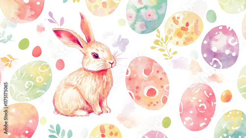 Beautiful patterns on Easter-themed eggs and rabbit on a white fabric. Easter day concepts. Generative AI Illustration.