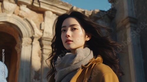 beautiful picturesque old europe ruin architecture stylish young profile view japanese woman poses with confidence and grace stylish costume cloth dress travel alone woman carefree in autumn season