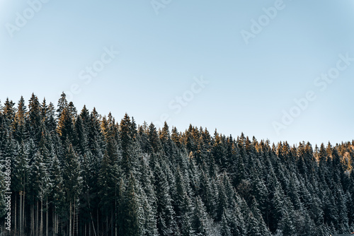 Beautiful pine tree with a moody, misty pine forest in the background. Forested mountain slope with blue sky at the background. Landscape concept