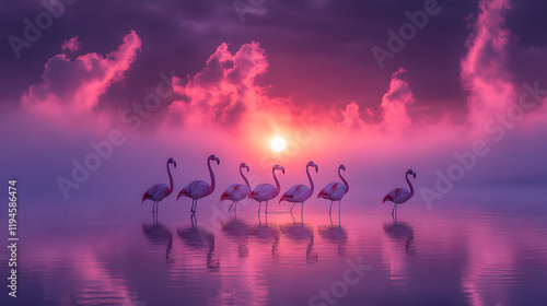 Beautiful pink and purple sunset with silhouettes of birds flying over the ocean