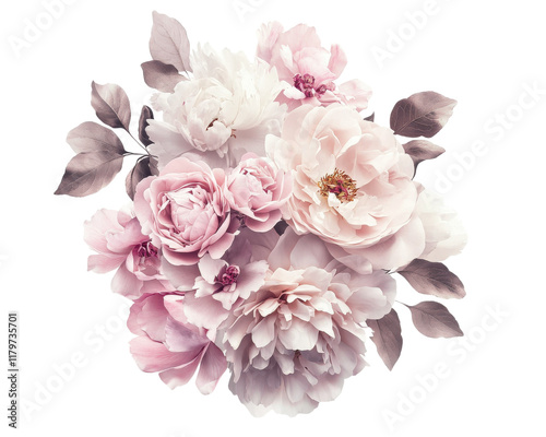 Beautiful pink and white flowers arranged elegantly on a white background.