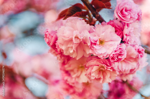 Beautiful pink cherry blossom in spring against blue sky