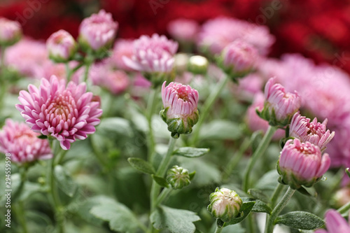 Beautiful pink chrysanthemum flowers with leaves, closeup