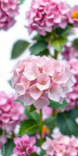 Beautiful pink hydrangea flowers blooming in a garden during springtime with lush green leaves surrounding them