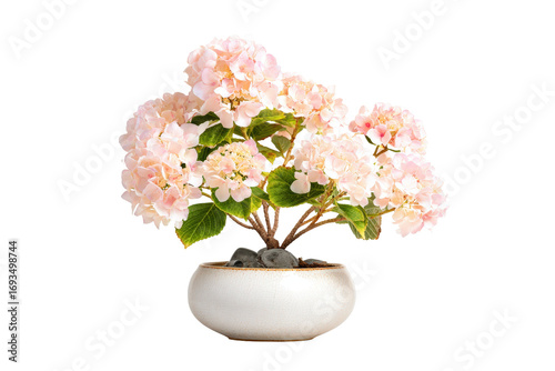 Beautiful pink hydrangea flowers in a ceramic pot isolated on white.