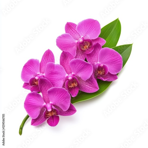 Beautiful Pink Orchids with Green Leaf on a White Background