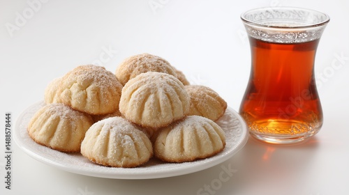 Beautiful plate of maamoul cookies with a glass of tea for Eid al-Fitr celebration