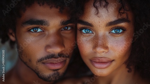 beautiful portrait of a young african american couple in love, with a black man and afro woman, closeup view showing the intimate details of their faces and emotions in a loving relationship