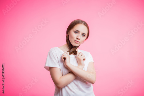 Beautiful portrait of young student girl with pigtails and white t-shirt on pink background