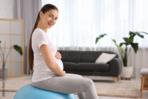 Beautiful pregnant woman doing exercises on fitball at home, space for text