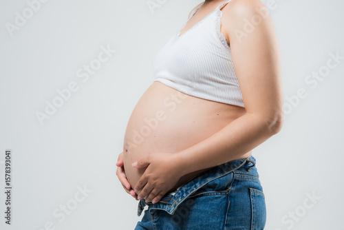 Beautiful pregnant woman hugging her tummy at home Studio.
