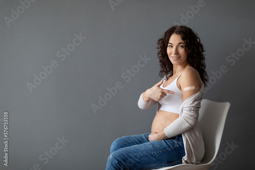 Beautiful Pregnant Woman Sitting On Chair And Showing Arm After Coronavirus Vaccination,