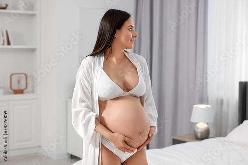 Beautiful pregnant woman wearing stylish comfortable underwear and robe in bedroom