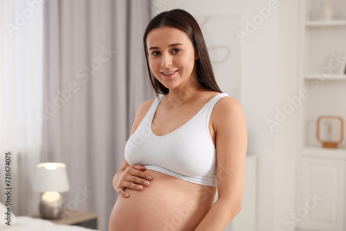 Beautiful pregnant woman wearing stylish comfortable underwear in bedroom