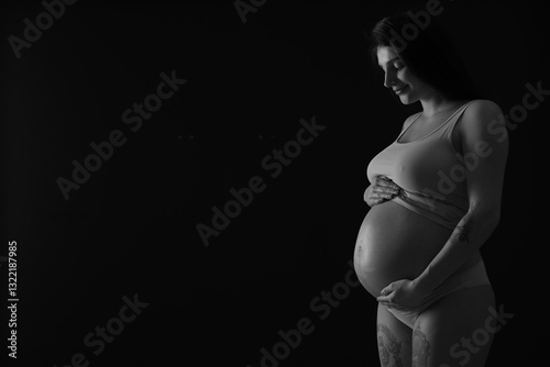 Beautiful pregnant woman with cute belly on dark background, space for text. Black and white effect