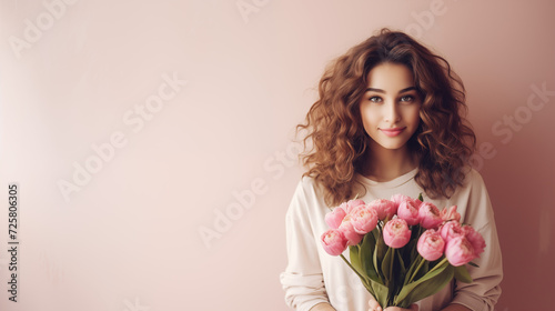 Beautiful pretty girls holding tulips on 8th March International Women's Day on one color background
