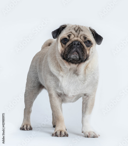 beautiful pug dog standing and looking to the camera on white background