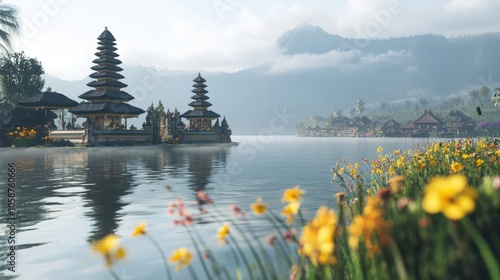 Beautiful Pura Bratan Temple Landscape in Bali with Lake, Flowers, and Surrounding Mountains