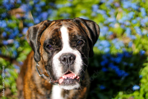 Beautiful purebred brindle boxer dog is lying in blue snowdrops