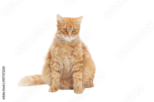 Beautiful red Cat looks at the camera. Kitten close-up on white background. Without people. Studio portrait of a ginger cat. Pet shop. Indoor cat.