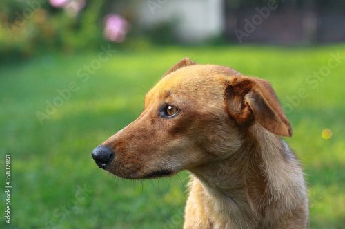 Beautiful red dachshund on nature plays on the green grass. A pet in the yard is looking for prey. The dog hunts for animals. Stock background